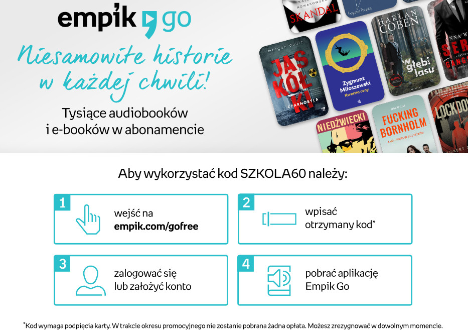 W ramach podziękowania za udział w konkursie Empik-u "1000 powodów, by czytać" nasza szkoła otrzymała dostęp do 30 000 e-booków, ponad 13 tysięcy audiobooków oraz podcastów na 60 dni w aplikacji Empik Go, całkowicie za darmo. Aby skorzystać z kodu, wejdź na empik.com/gofree i postępuj zgodnie z instrukcją. Kod: SZKOŁA60, można aktywować do 30.11.2020 r i przez 60 dni cieszyć się darmowym dostępem do e-booków.