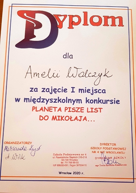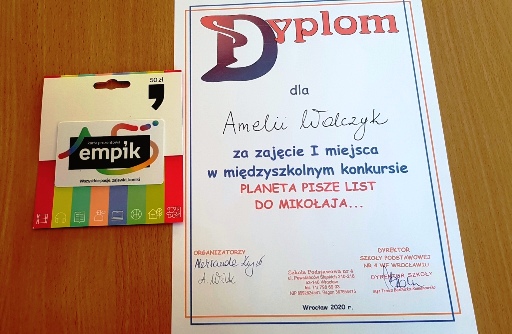 Uczennica naszej szkoły - Amelia Walczyk z kl. 7a - zajęła pierwsze miejsce w międzyszkolnym konkursie "Planeta pisze list do Mikołaja ...".