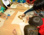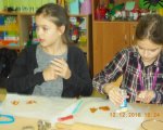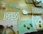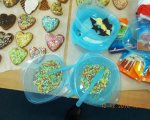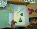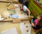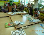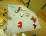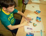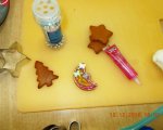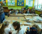 Praca, która okazała się być świetną zabawą, rozpoczęła się, gdy z przepastnych toreb przyniesionych przez Panią Agnieszkę wypłynęły, na przygotowane wcześniej stoły, wspaniałej urody i smaku dekoracje. W rozłożonych przed dziećmi miseczkach zagościły kolorowe posypki, czekoladowe i cukrowe dekoracje w świątecznych kształtach, różnobarwne lukry i marcepany a także specjalne pisaki do zdobienia pierniczków w wielu atrakcyjnych kolorach. Ozdoby te kusiły swym wyglądem małych wykonawców, ale pierwszym zadaniem do wykonania było przygotowanie pierniczków do wypieku. Świetliczaki "uzbrojone" w wałki do ciasta, deseczki oraz świąteczne foremki zabrały się do dzieła. Pierniczki o magicznych kształtach, ułożone fantazyjnie na blachach, przenoszone były przez nasze miłe mamy do szkolnej kuchni i wypiekane, po czym wracały do naszej świetlicowej sali by zostać poddane zabiegom upiększania.