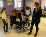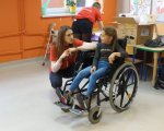Podczas warsztatów "wchodzę w rolę" dzieci w szkołach zetknęły się z problemami, które na co dzień pokonują ich niepełnosprawni rówieśnicy, na przykład przemierzają trasę wózkiem inwalidzkim, o kulach, z laską, w czasie gdy opaska zasłania oczy. Komunikują się bez słów czy wykonują różne czynności bez użycia jednej ręki lub nogi. Taką możliwość miały również dzieci z klas 1c, d ,e, f. To kilka zadań, z którymi podczas warsztatów stykają się wrocławskie przedszkolaki i uczniowie podstawówek z klas 0-3. Dla dzieci to nie tylko szansa na dobrą zabawę. Nasi podopieczni mogli przekonać się, jakie są rodzaje niepełnosprawności i jak wygląda codzienne życie ich rówieśników, na przykład jak kilka schodków lub krawężnik mogą utrudnić, a czasem uniemożliwić zwykłe funkcjonowanie. Otrzymali także lekcję savoir-vivre’u: dowiadzialy się, jak zaproponować pomoc osobie z niepełnosprawnością albo jak pomóc, żeby nie zaszkodzić.