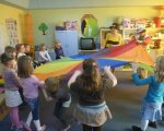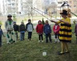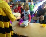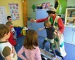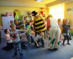 Dnia 28 marca do grupy zerowej przybyli goście: Pani Pszczoła i Klaun Łatek. Specjalny repertuar gier, zabaw, animacji, dzięki którym dzieci mogły twórczo i radośnie spędzić czas, pozwolił na integrację grupy. Dzieci z animatorami udali się w podróż na poszukiwanie Piotrusia Pana. Wykonały z kartonów i bibuły „paszczaki”, aby bronić się przed piratami. Następnie uczyły się sztuczek cyrkowych i bawiły się w przeciaganie liny oraz chutą Klanzy. Uśmiech towarzyszył im przez cały czas zabawy, szczególnie, gdy Pani Pszczoła malowała im twarze. Niespodzianką okazał się tort, przyniesiony przez rodziców Hani, z okazji jej urodzin.
