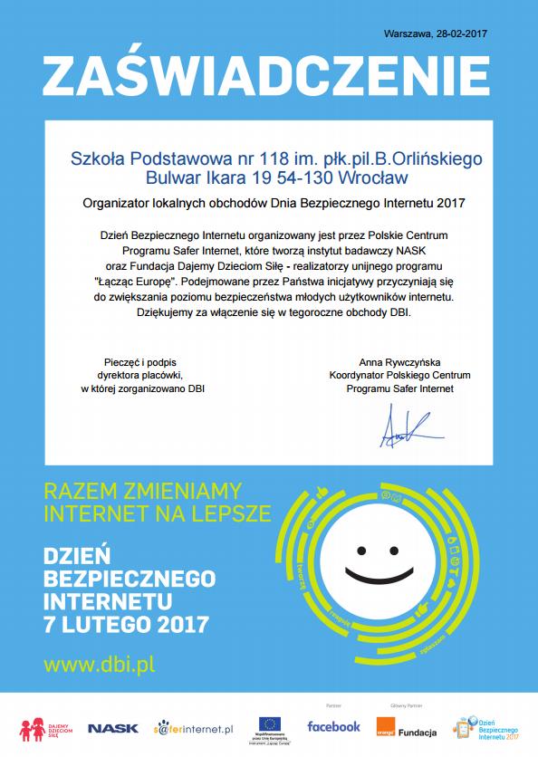 Administratorem danych jest Szkoła Podstawowa nr 118 im. płk. pil. Bolesława Orlińskiego we Wrocławiu, ul. Bulwar Ikara 19, 54-130 Wrocław. Kontakt do naszego inspektora ochrony danych: Tomasz Grzybowski, inspektor@coreconsulting.pl lub CORE Consulting sp. z o.o., ul. Wyłom 16, 61-671 Poznań. Szczegółowe informacje o regułach przetwarzania danych związanych z prowadzoną korespondencją e-mail znajdzie Pan/Pani na www.sp118.pl.