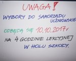 10.10.2017 r. odbyły się wybory do Samorządu Uczniowskiego, które poprzedzone były kampanią przedwyborczą. W holu szkoły zawisły plakaty kandydatów wraz z napisanymi przez siebie programami. Ostatecznie skład Samorządu Uczniowskiego będzie następujący: