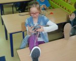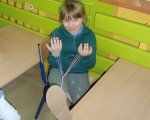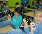 Zastanawialiście się kiedyś nad tym, jak ludzie w średniowieczu radzili sobie bez guzików, szelek, zamków błyskawicznych? Jak to się działo, że przechadzając się po drogach, pracując czy załatwiając jakieś sprawy, co chwilę nie gubili części swojej garderoby? Świetliczaki z nasze szkoły nie tylko znają odpowiedzi na te pytania, ale potrafią też samodzielnie korzystając z średniowiecznych metod skręcić sznurki niezbędne do tego, by kapelusze lub spodnie pozostawały na swoim miejscu. Wyplatanie sznurów okazało się nie lada wyzwaniem i momentami przypominało walkę z przerażającymi smokami, ale nam przecież żadne zadanie niestraszne i każdy Świetliczak wie, że im trudniejsze wyzwania, tym większa satysfakcja, gdy coś nam się uda. Sztukę wyplatania opanowaliśmy na tyle dobrze, że teraz potrafimy, oczywiście odmierzając łokciami, wypleść sznurek do kapelusza, który może przeobrazić się w gustowną bransoletkę lub zawieszkę do breloczka.